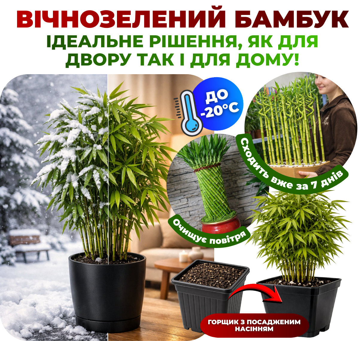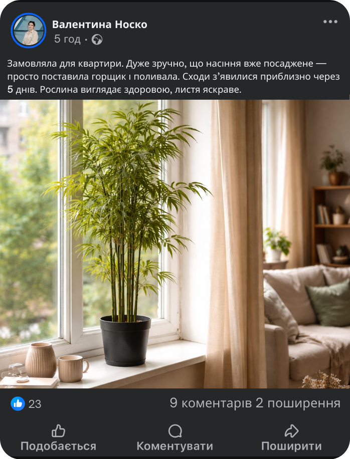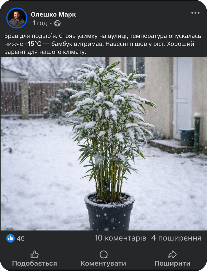 Даний сорт спеціально адаптований до нашого клімату, добре переносить перепади температур і підходить як для вирощування в приміщенні, так і для подальшої висадки у відкритий ґрунт. Бамбук швидко розвивається, зберігає декоративний вигляд протягом усього року та легко формується обрізкою. Рослина не потребує складного догляду, тому підходить як для досвідчених садівників, так і для тих, хто тільки починає займатись озелененням.