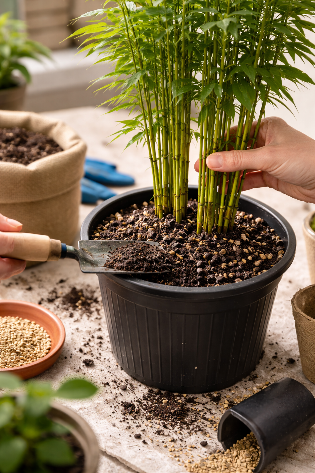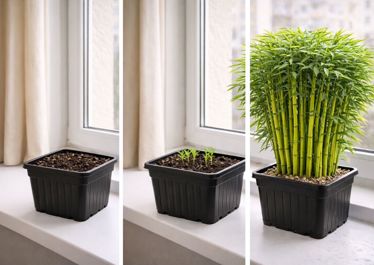 Ми використовуємо спеціальний поживний субстрат із уже висадженим та підготовленим насінням вічнозеленого бамбуку. Вам не потрібно нічого сіяти чи пересаджувати — достатньо поставити горщик у світле місце та періодично зволожувати ґрунт. Бамбук росте сам і підходить навіть для новачків.